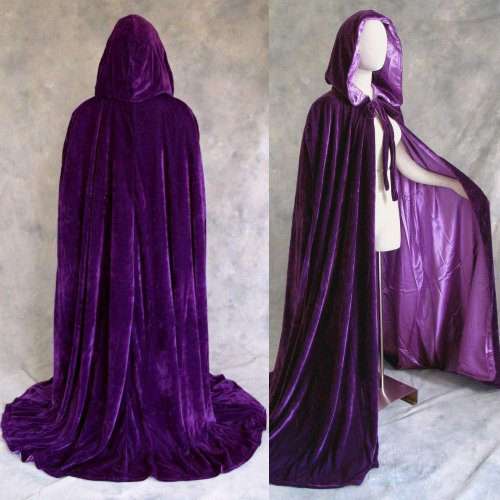 This long, hooded cloak is made from a deep purple velvet material and then entirely lined in a matching purple satin, including the hood. It has shaped shoulders and closes in front with a long tie made from the same purple velvet material as the body of the cloak. The cloak lining is fully attached along the front seams and at the bottom hem and neckline.