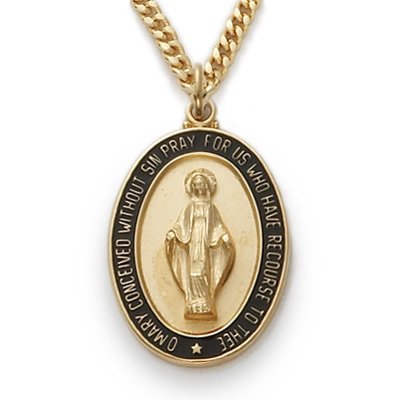14K Gold Filled 7/8" Oval Engraved Black Border and Polished Finish Miraculous Medal on 24" Silver Chain